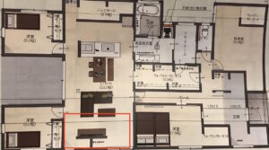 我が家の間取りをご紹介しますと、こんな感じになっております。 赤く囲んだ箇所がテレビ部分です。